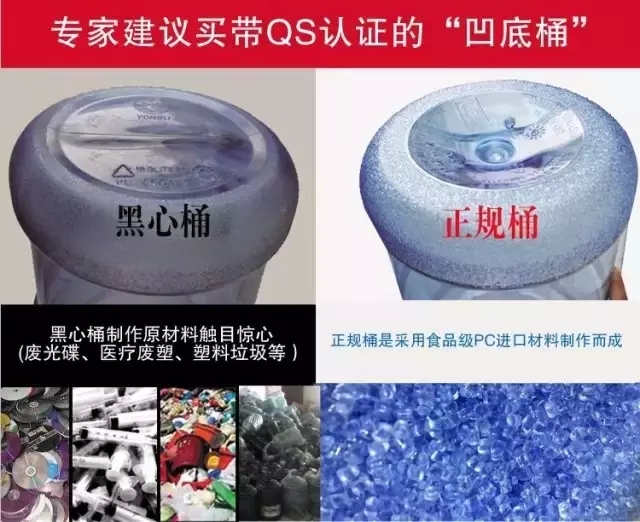 据了解,市场上出现的饮用水水桶共有4类:食品级的全新材料pc(聚碳酸酯)桶、非食品级pc桶、pet桶和使用废旧塑料、废弃光盘制成的“黑心桶”。